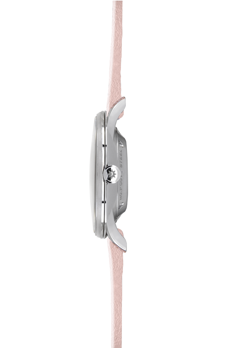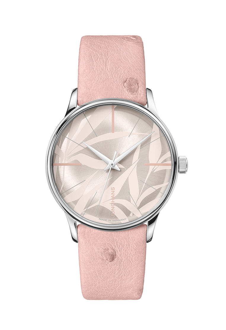 Convex dial in matt silver-plated, with sunray brush and transparent light pink bamboo leaf printing Diamond-cut dauphine hands