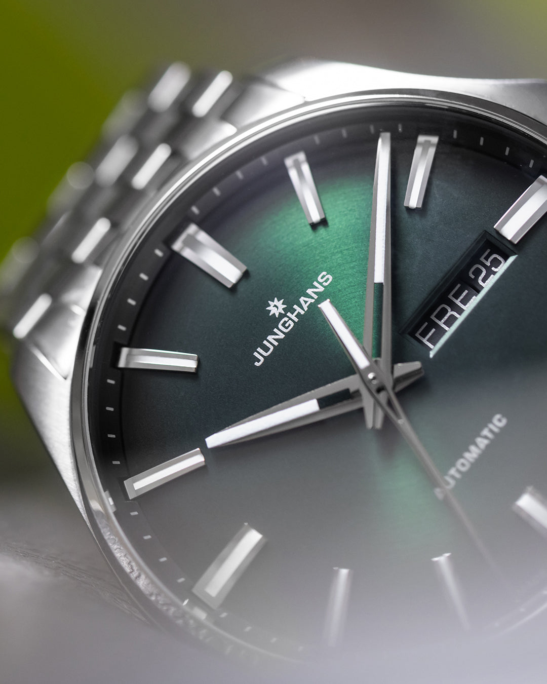 domed dial with dark green effect lacquer, appliqués with white environmentally-friendly luminous substance, hands partially skeletonised, white luminous substance on the hour and minute hands and the counterweight of the second hand